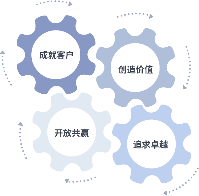 成就客户是一切决策的出发点,,,创造价值是衡量所有工作的标准,,,追求卓越是我们做事做人的态度,,开放共赢是我们的格局也是最终的结果。。。价值观的齿轮环环相扣,,,推动着组织里的每个人不断向前。。。。
