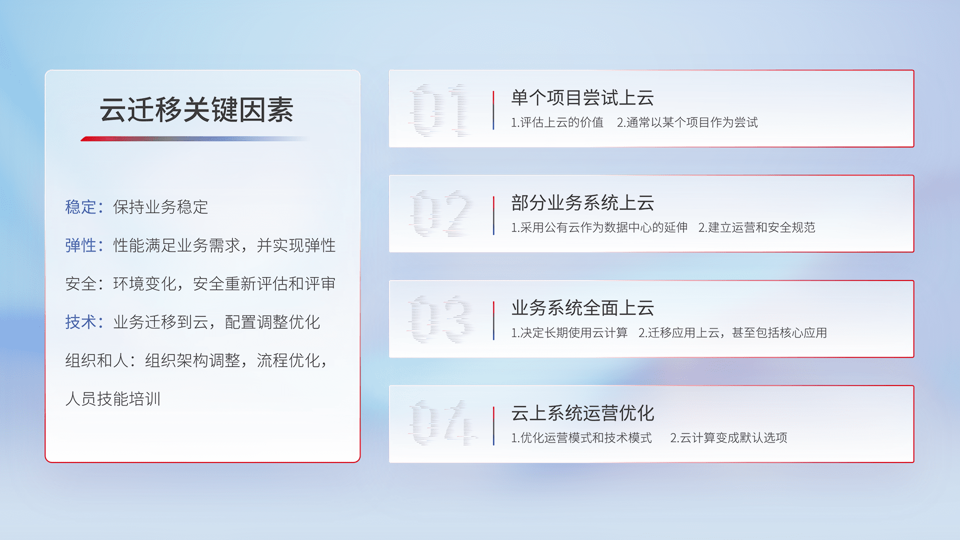 结合实际业务,,,从规划设计、、云平台选型、、、、云原生改造、、、、数据迁移、、集成交付,,,,迁移全过程为客户识别最佳上云路径,,,做好风险识别管理,,设计网络架构、、身份权限、、、、安全审计合规、、、操作审计、、、、日志审计、、、、监控告警策略、、、、多站点容灾设计等,,对云上基础设施进行整体规划,,,提升IT治理水平,,以满足弹性、、、、高可用、、高性能的需求。。
